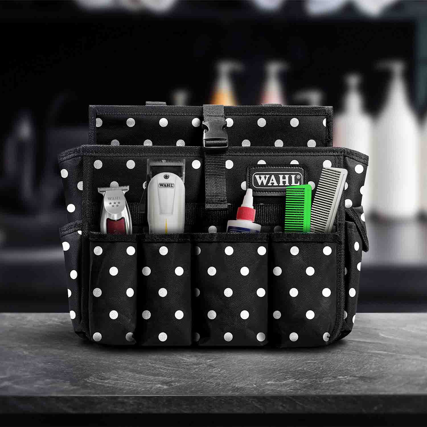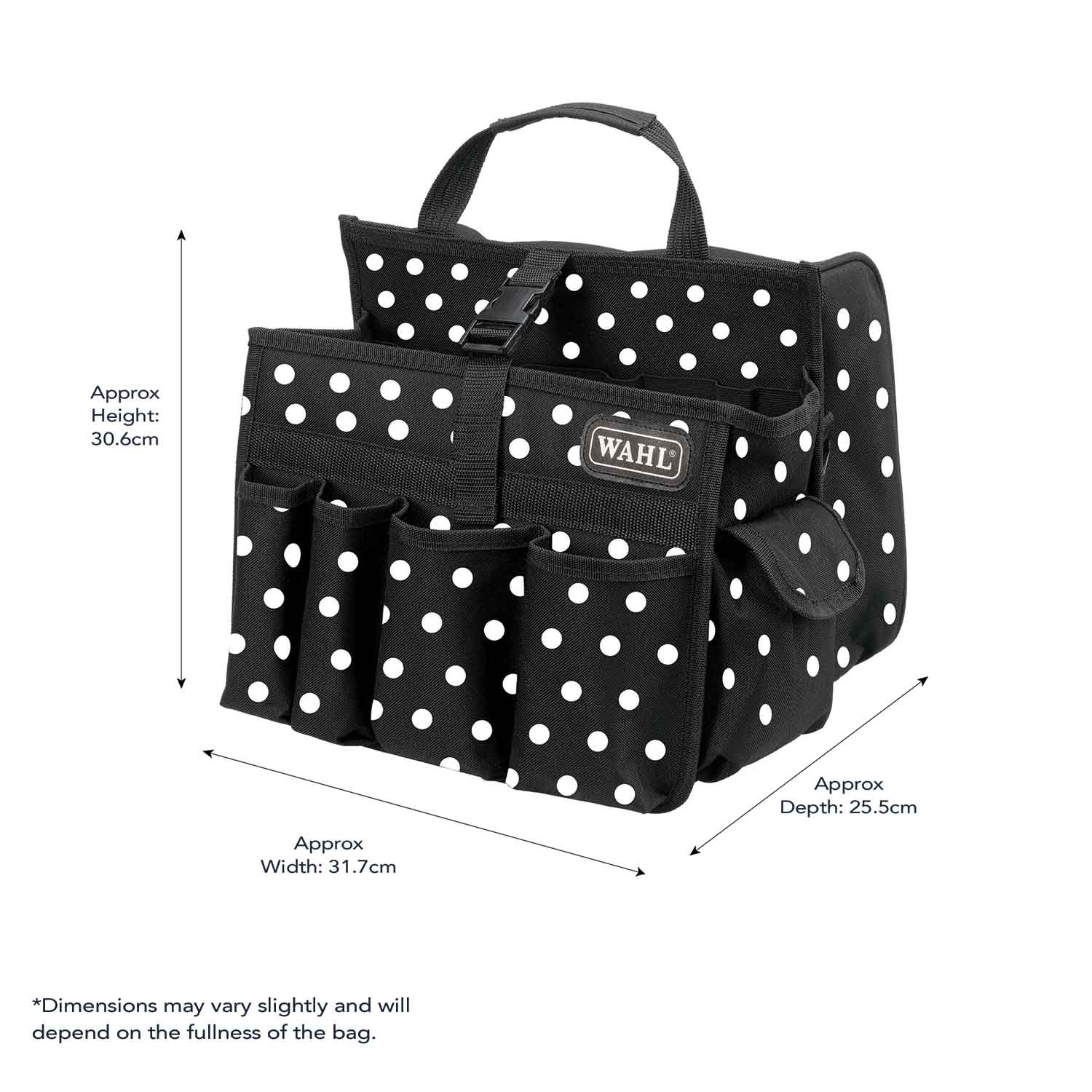 Wahl Student Polka Dot Tool Carry. A limited edition white on black polka dot design tool carry with a sturdy carry handle and an adjustable shoulder strap. It features many compartments and pockets to fit all your necessary tools and equipment in.