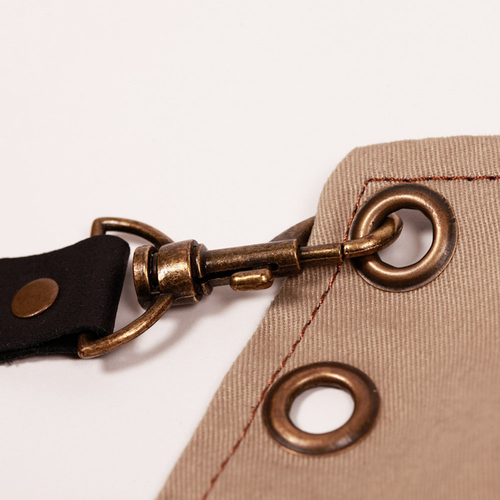 Dark Stag Barbers Apron, a hand stitched in comfortable, breathable and durable tan canvas with black and brown pockets and loops which are secured with strong rivets to provide long lasting storage for all essential tools, adjustable waist and neck straps are secured with brass hook holes and lobster clasps providing flexibility to fit barbers of all shapes and sizes. The Dark Stag barber barber apron will age well, gaining character through use and with proper care, maintaining the look of refinement this apron so naturally gives.